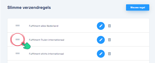 De slimme verzendregels werken in een bepaalde volgorde. De bovenste regel gaat als eerste af, voldoen de gestelde voorwaarden, dan worden de bijbehorende acties uitgevoerd. Daarna wordt er gekeken naar de volgende regel enzovoorts.