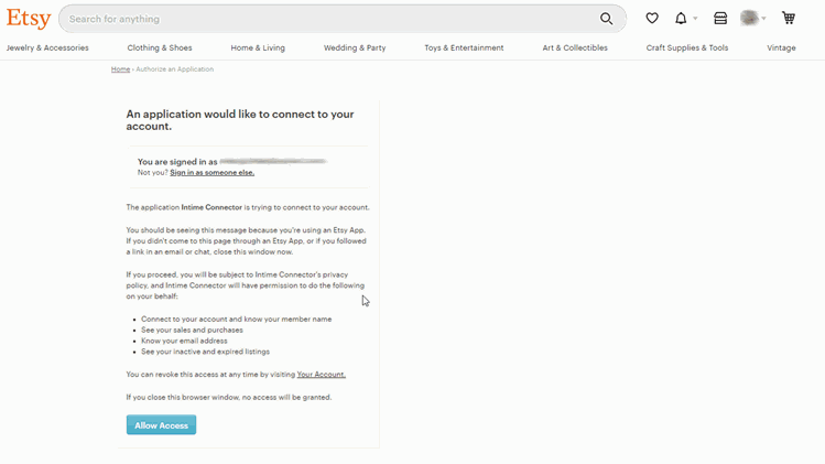 4. Je Etsy-omgeving wordt nu geopend. Je ziet nu een aanvraag om de Intime Connector te verbinden aan je webshop