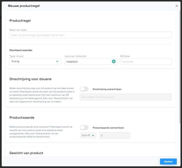 Doel van de handleiding: Je kunt handmatig een productregel aanmaken om deze op een later tijdstip aan een product uit je webshop te koppelen. Met behulp van productregels wordt bepaalde informatie die nodig is om je zendingen in te boeken automatisch ingevuld door ons systeem. Deze feature is met name handig als je veel dezelfde soort producten hebt. Je kunt dan eenvoudig een productregel aanmaken en deze toepassen op verschillende producten.