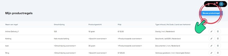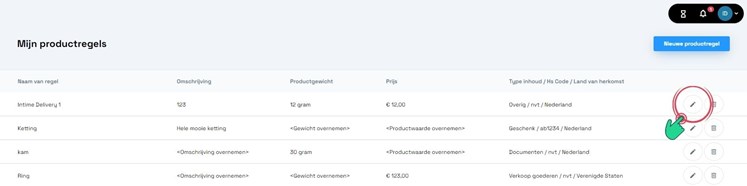 2. Zoek de productregel op in het overzicht van al je productregels en klik aan de rechterkant op het symbool van het pennetje