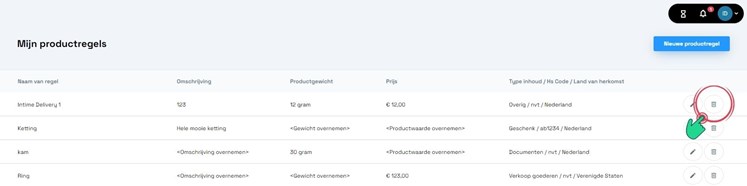 2. Dit doe je eenvoudig door achter de productregel die je wil verwijderen op het prullenbak-icoontje te klikken